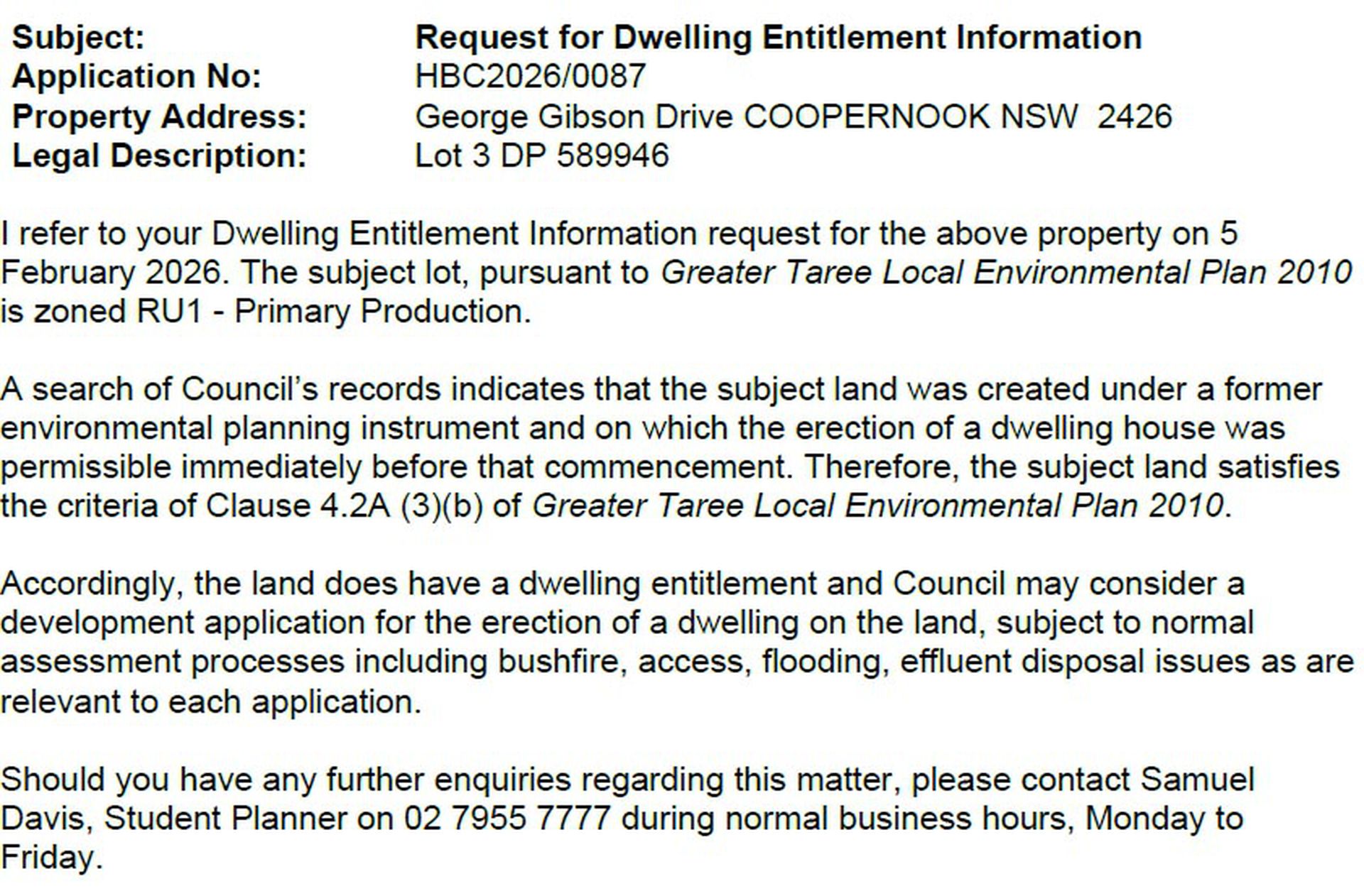 Zoned RU1 – Primary Production (Greater Taree LEP 2010). A previous Development Application (DA) for a dwelling was approved on this lot (now lapsed), indicating that Council has previously supported residential development on the site, subject to standard assessment requirements. Supporting documentation, including flood information, plans and reports are available for review.